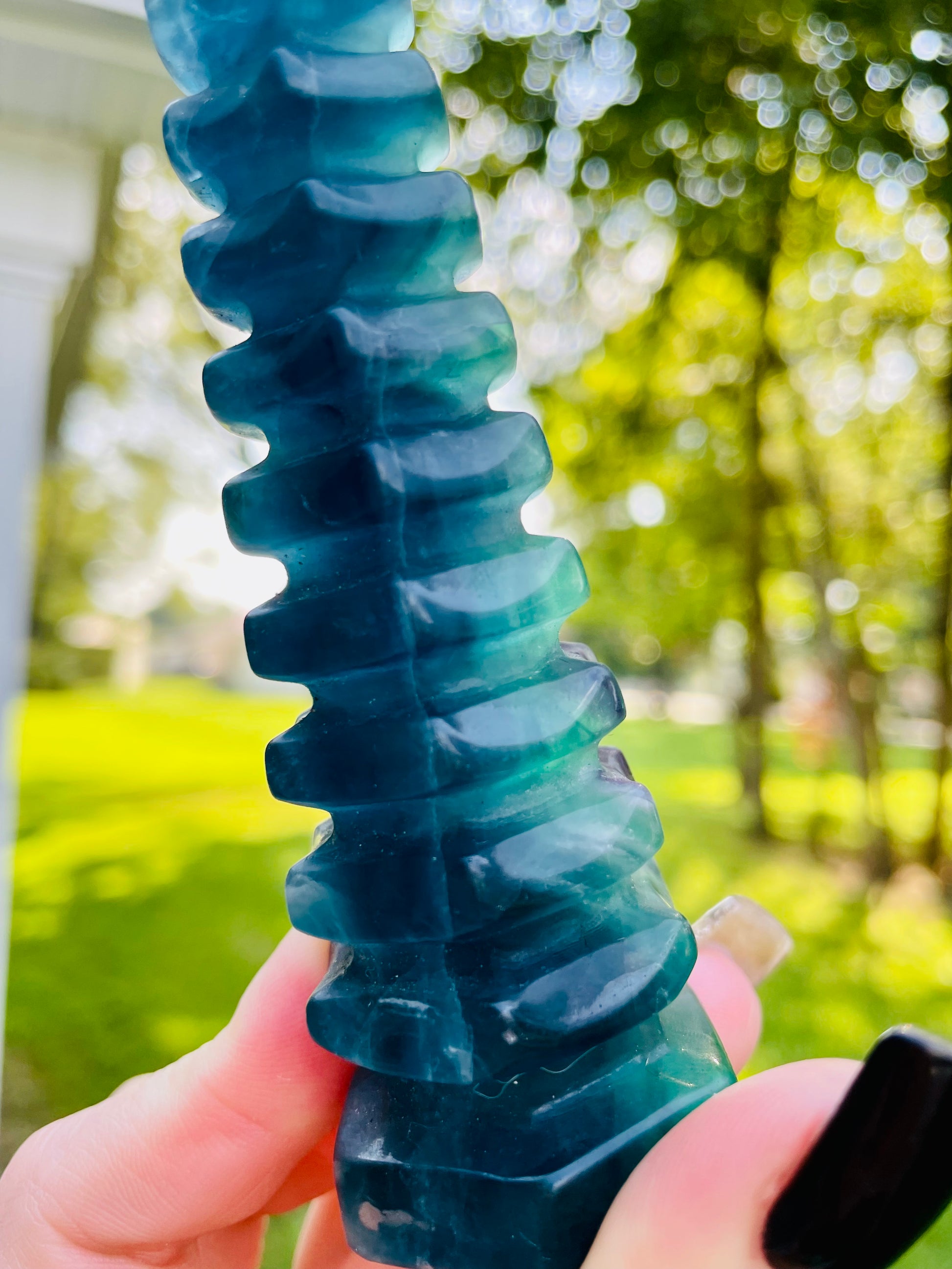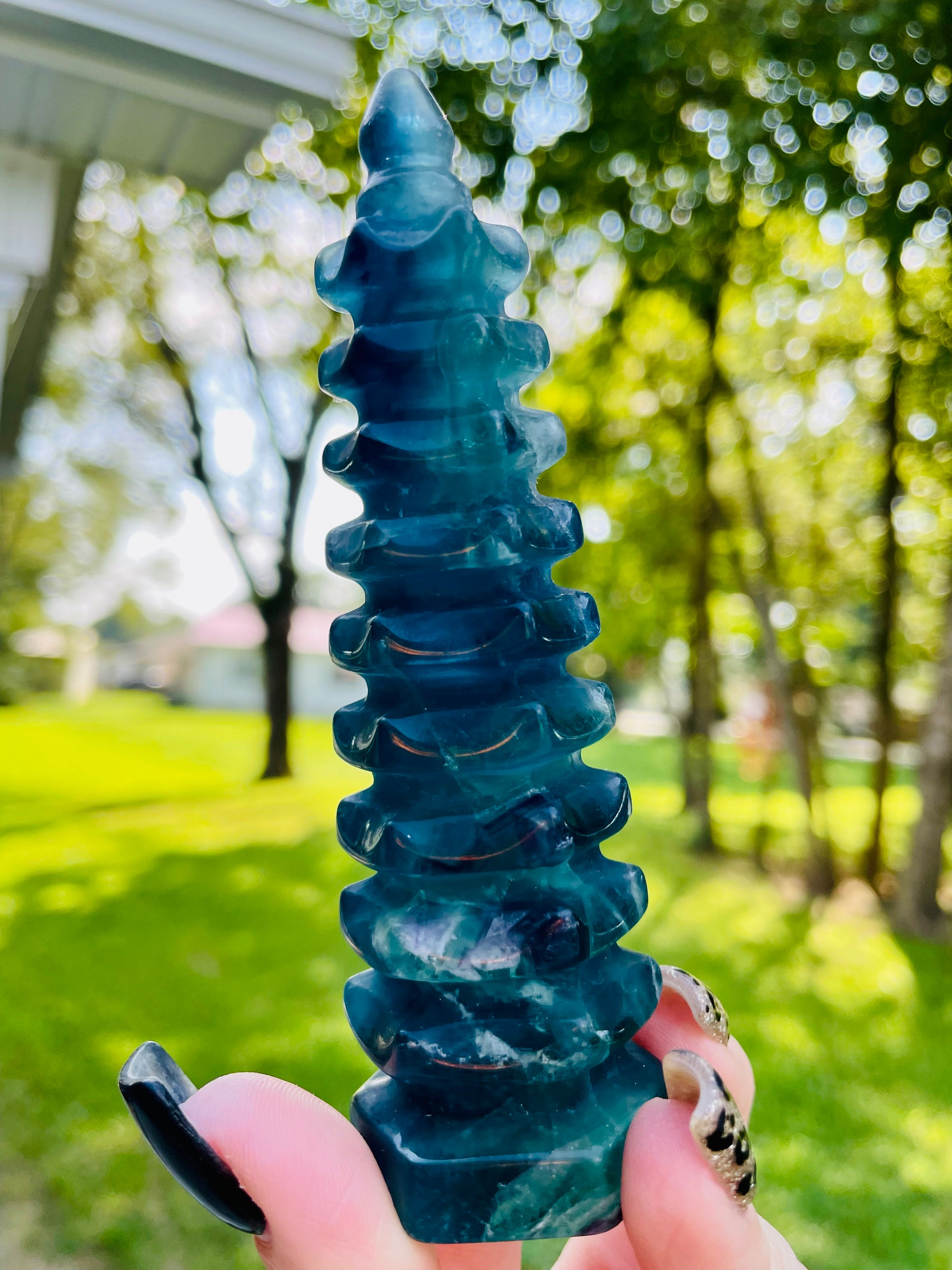 Features: Beautiful Hand-Carved Fluorite Wen Chang Tower with tons of rainbows and color