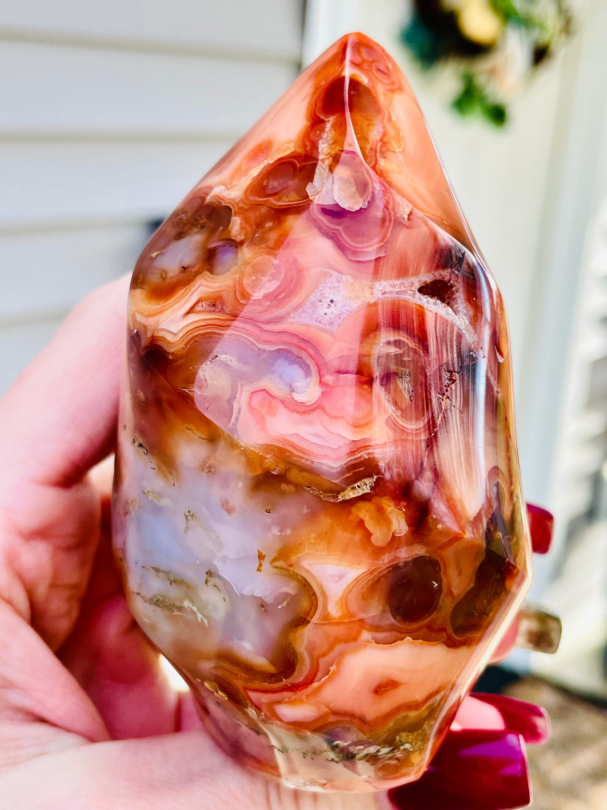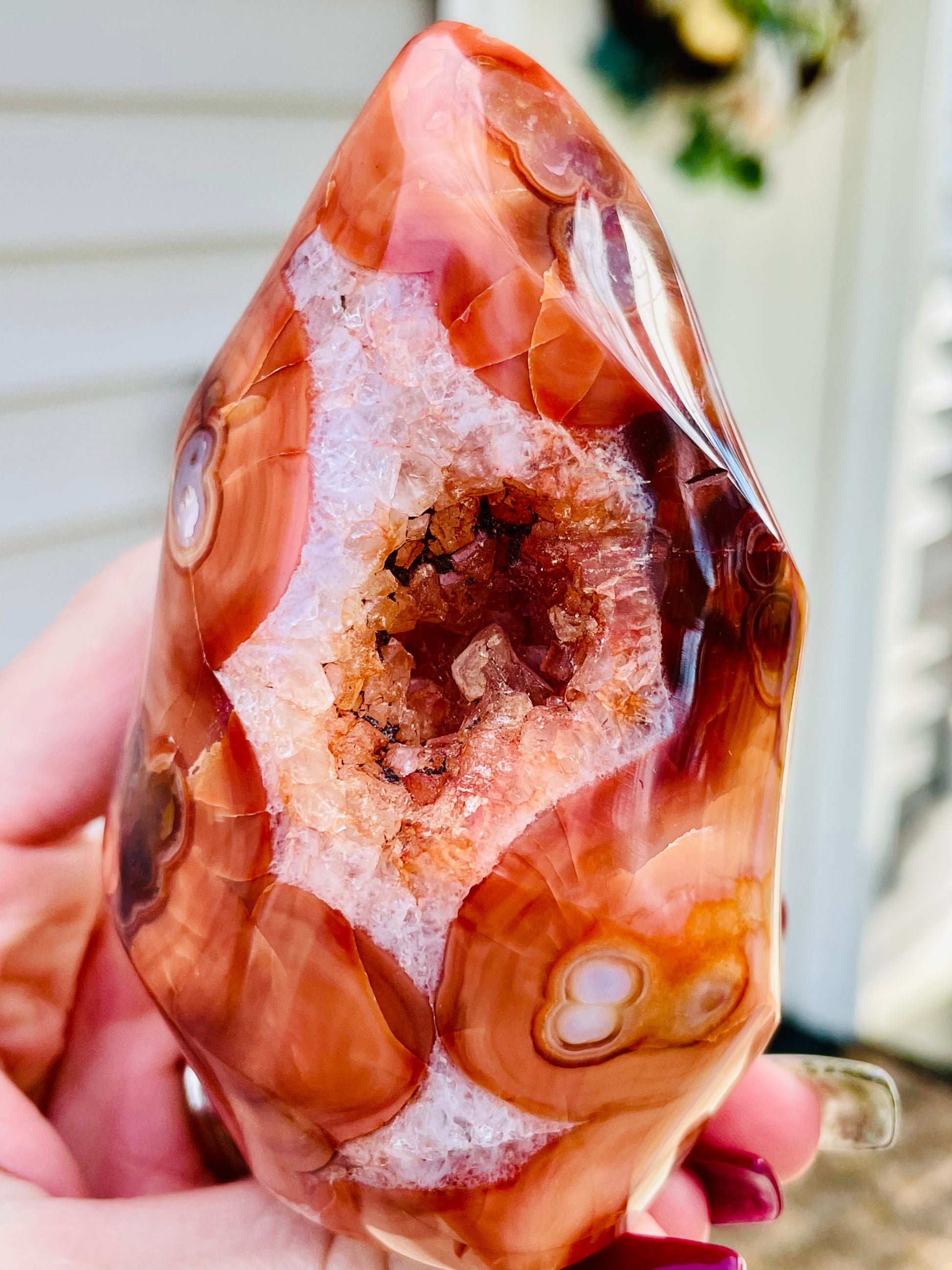 Features: stunning reds, and oranges with eyelets and druzy Quartz pockets