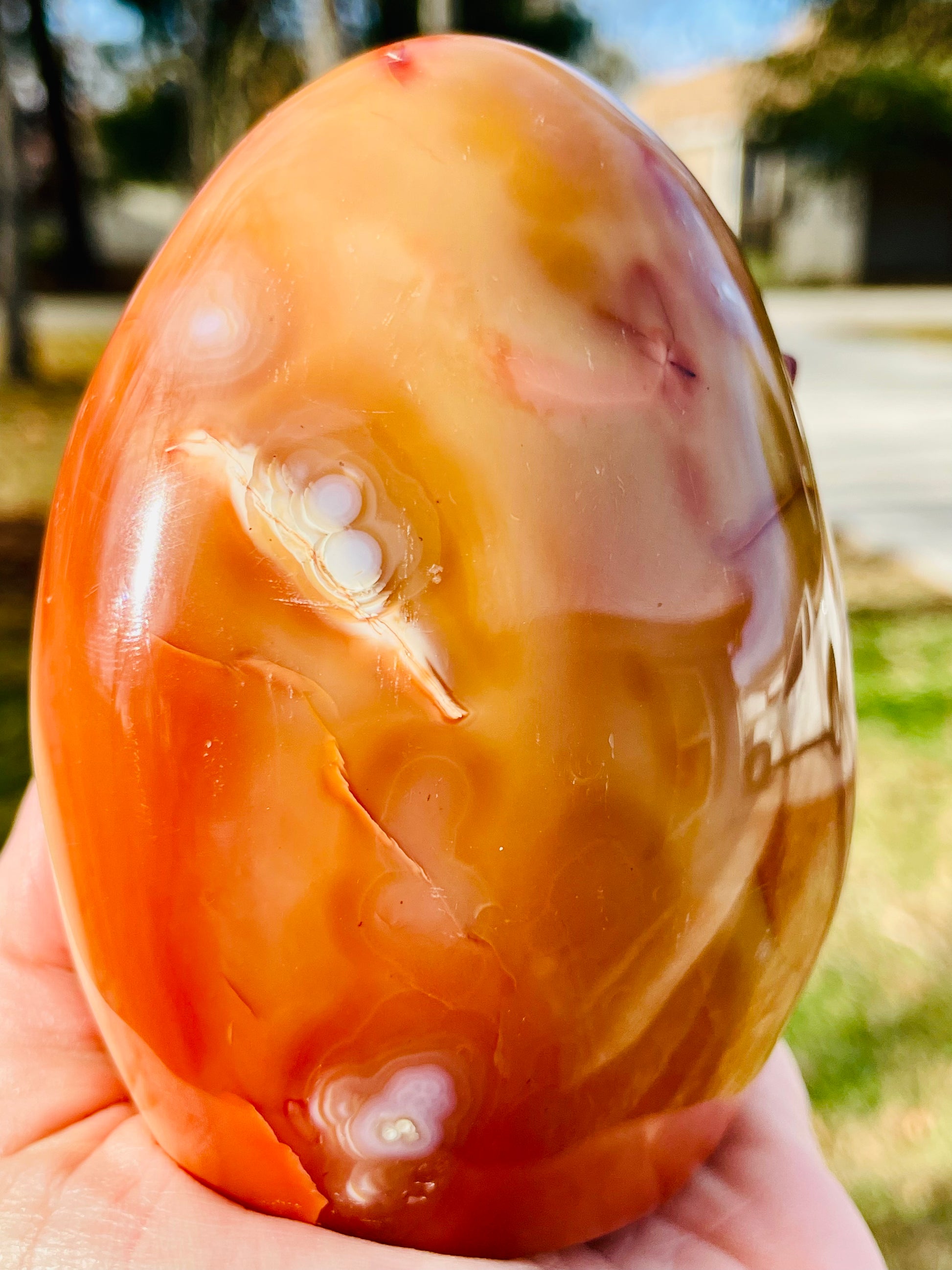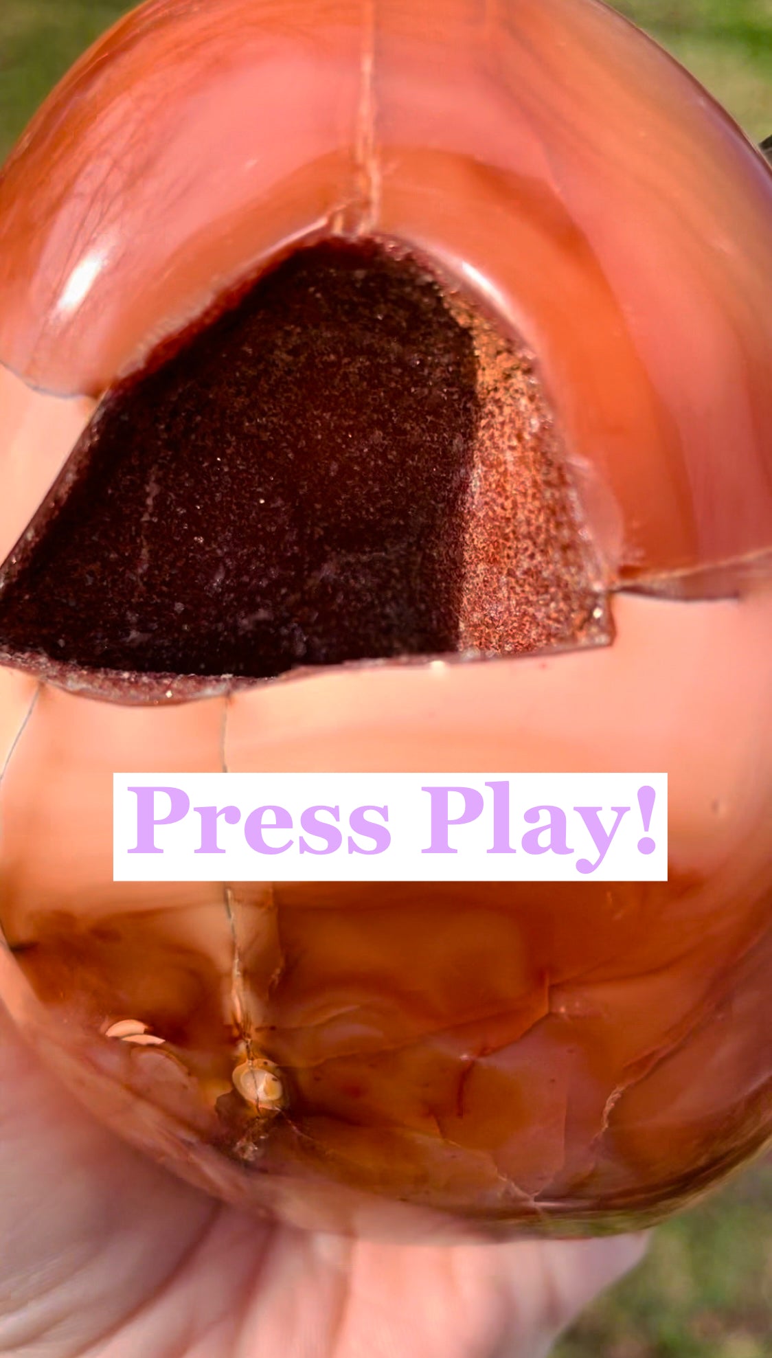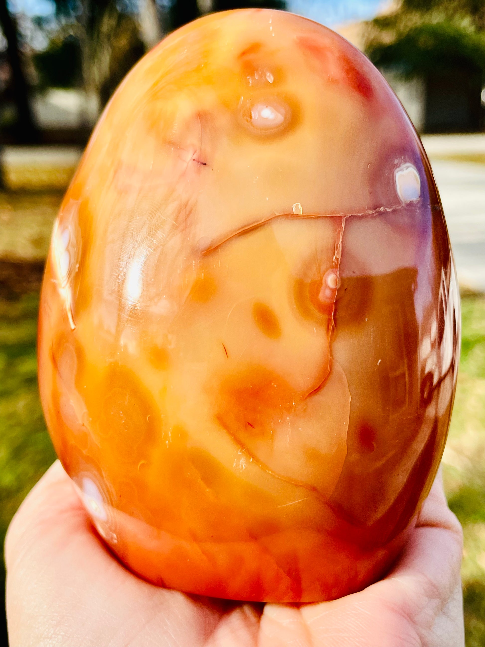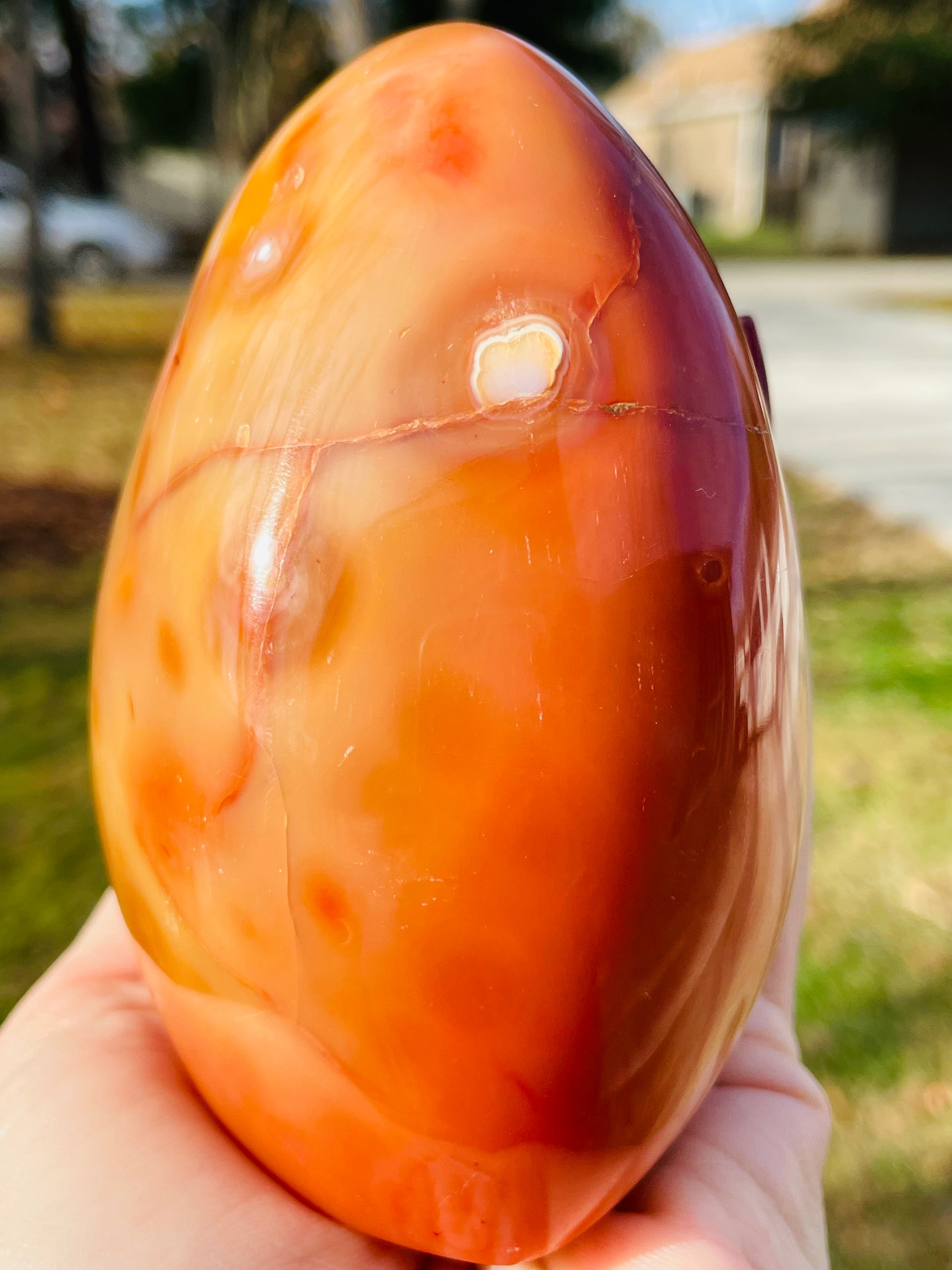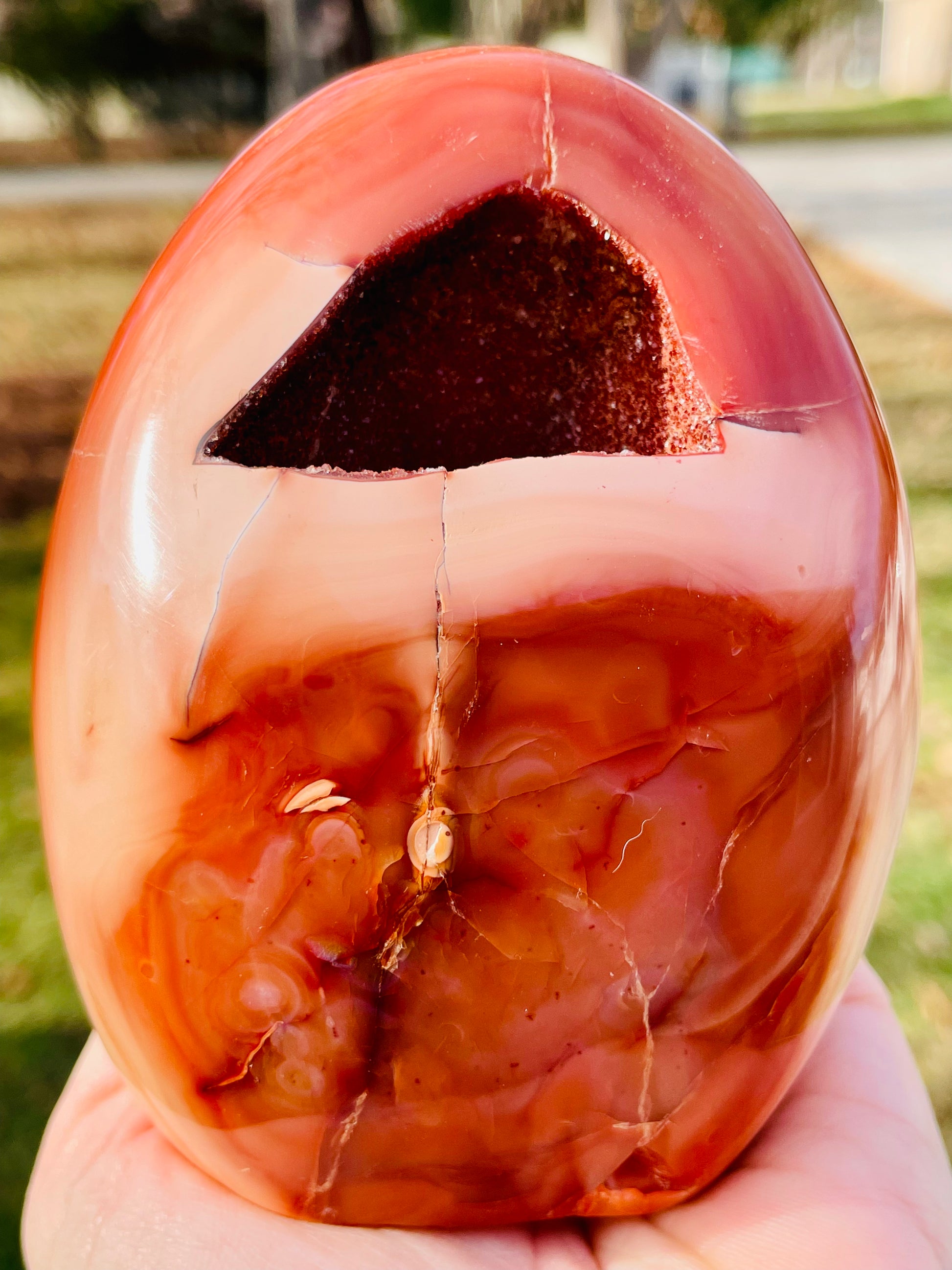 Features: deep red and orange colors with a deep red druzy Quartz fissure