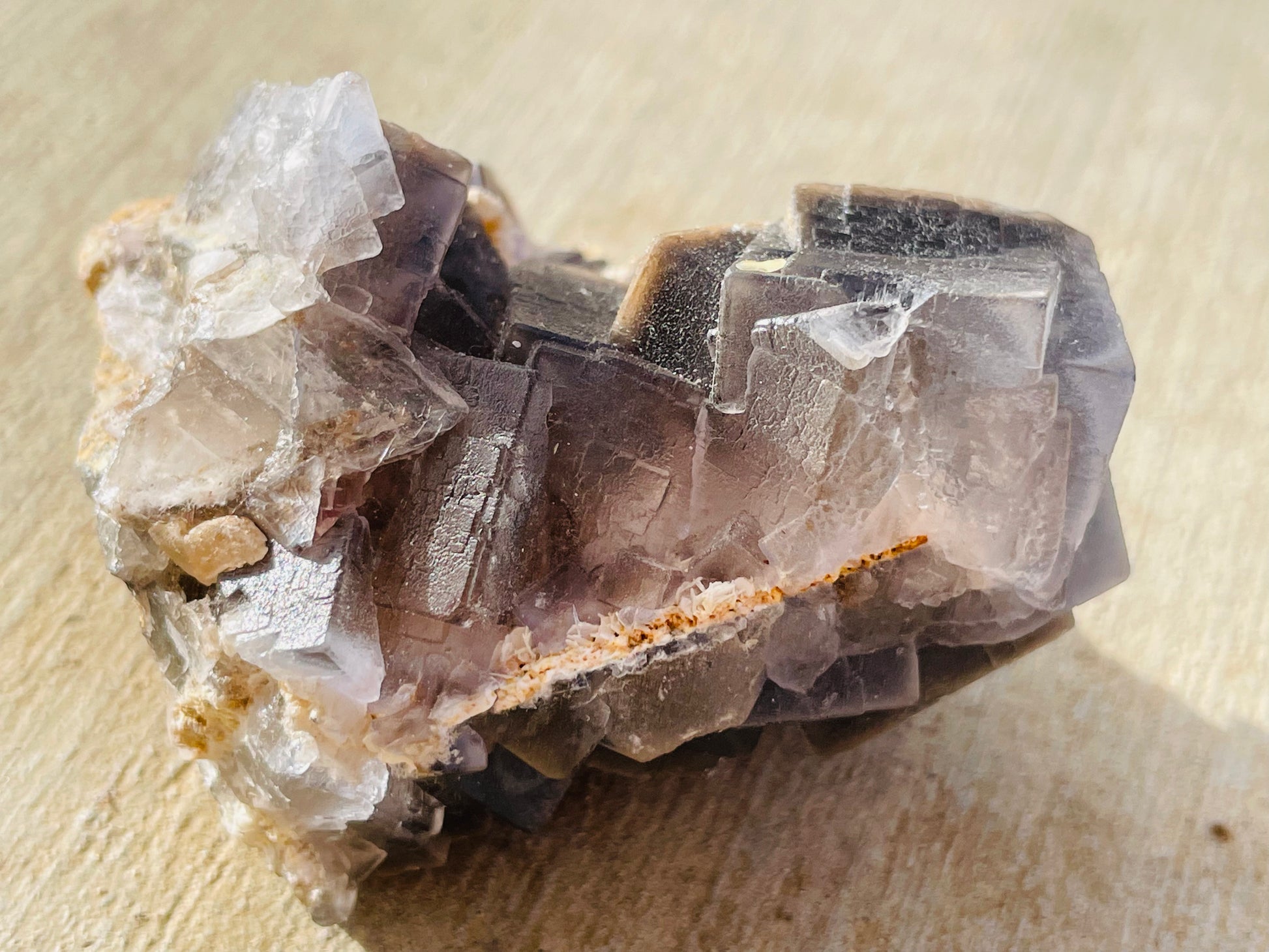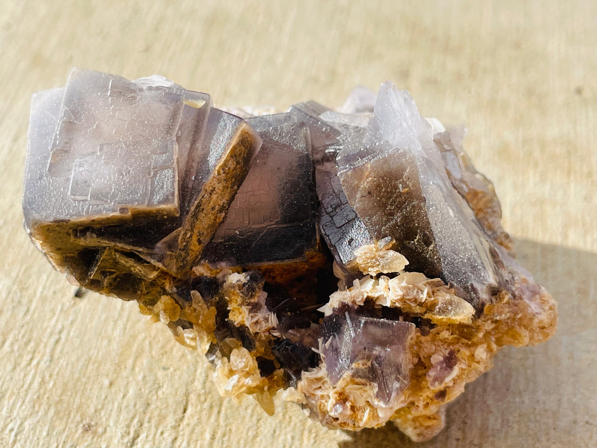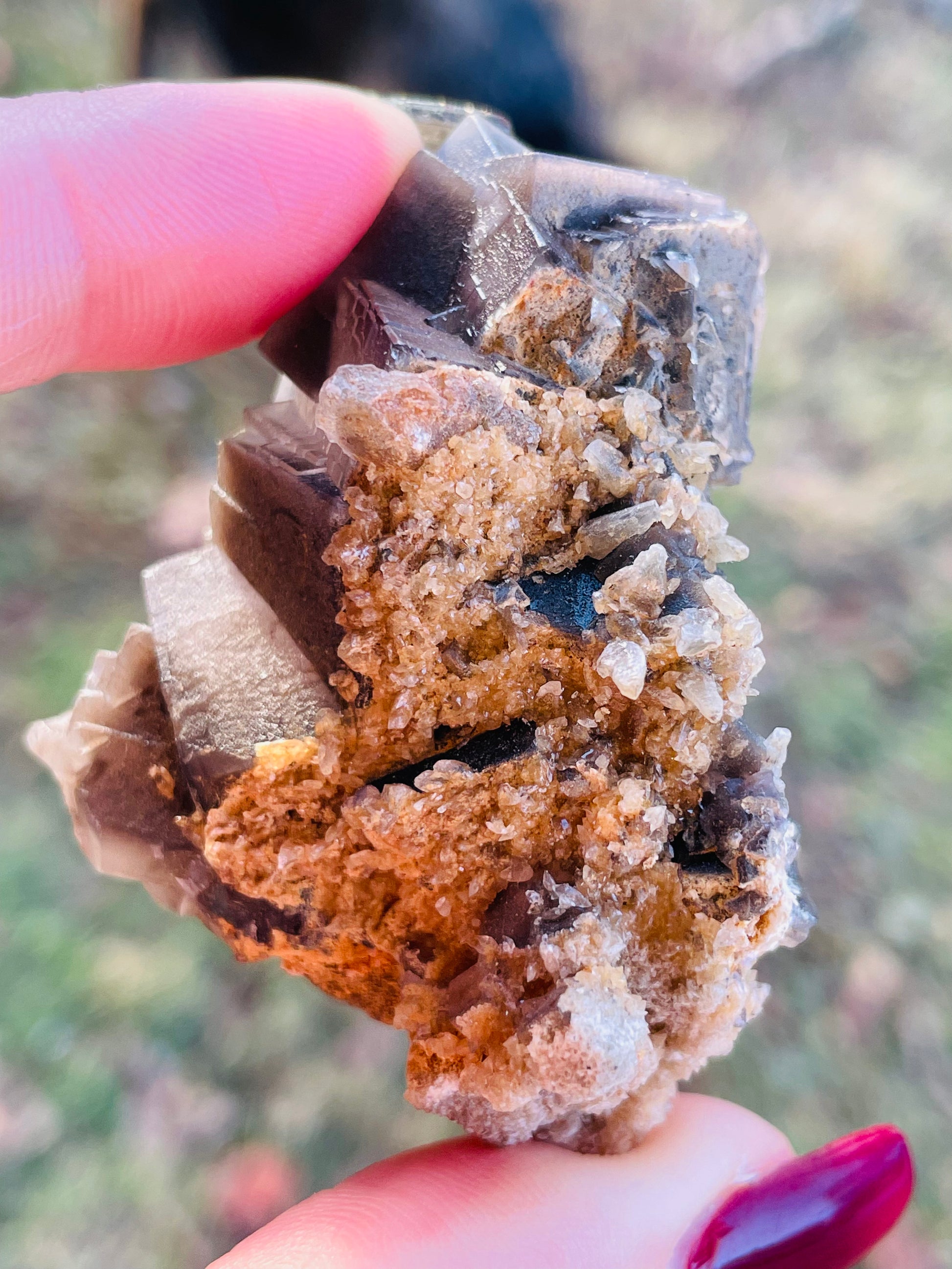 Features: Smokey purple-grey coloring with baby dog tooth calcites
