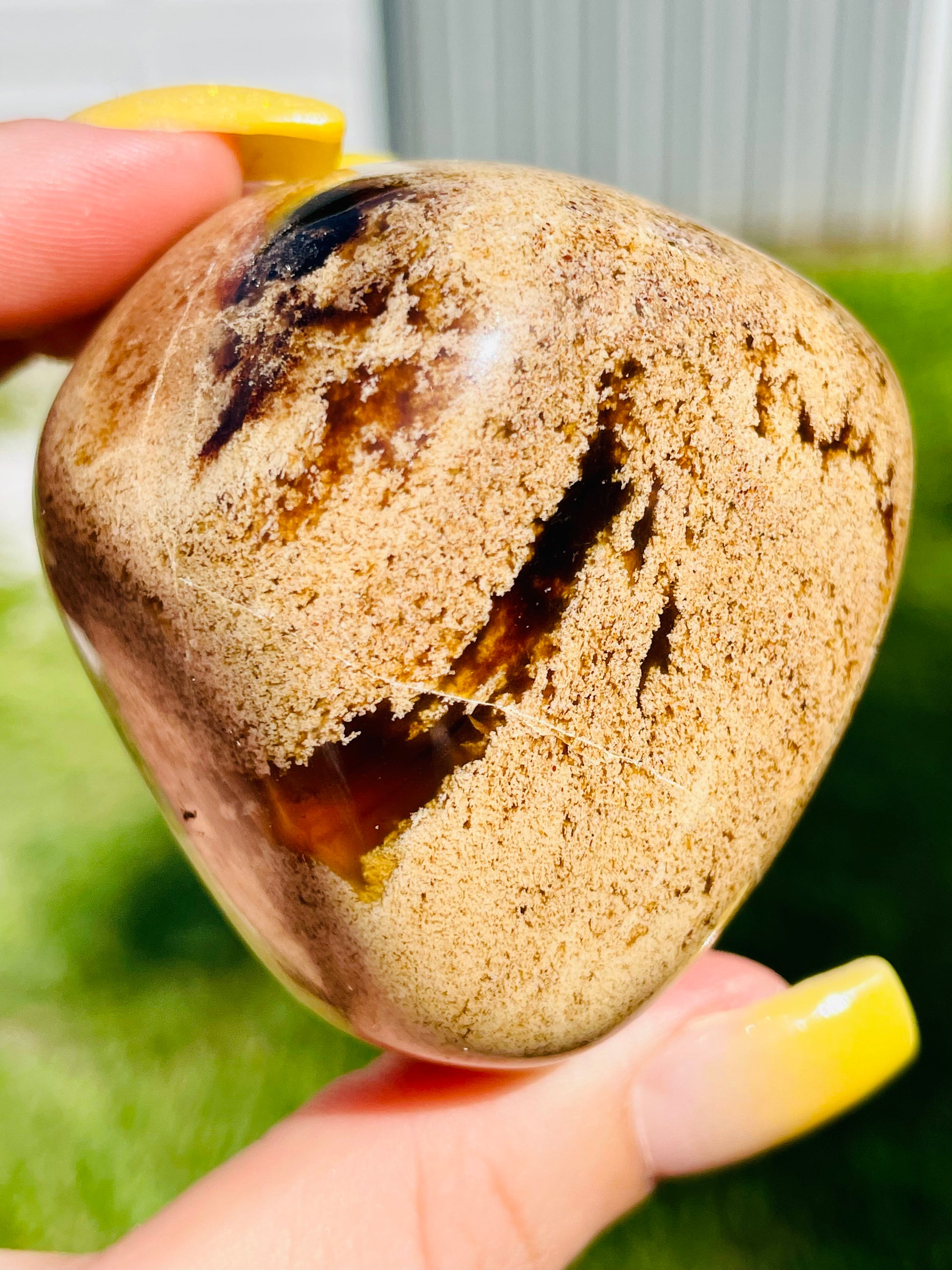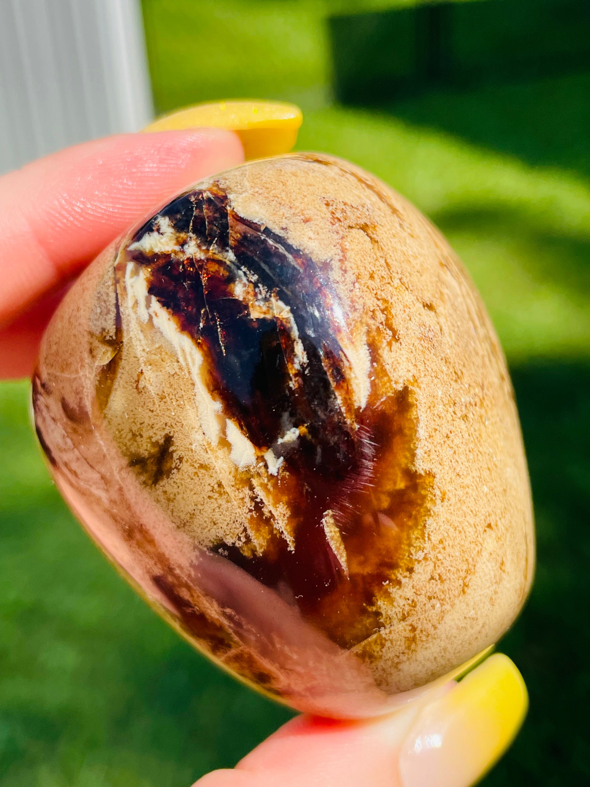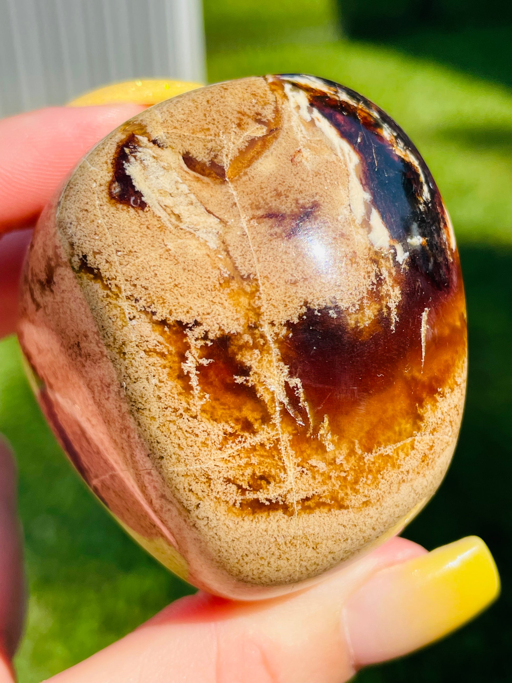 Features: light creamy color with hints of dark & light chocolate-colored amber seeping through