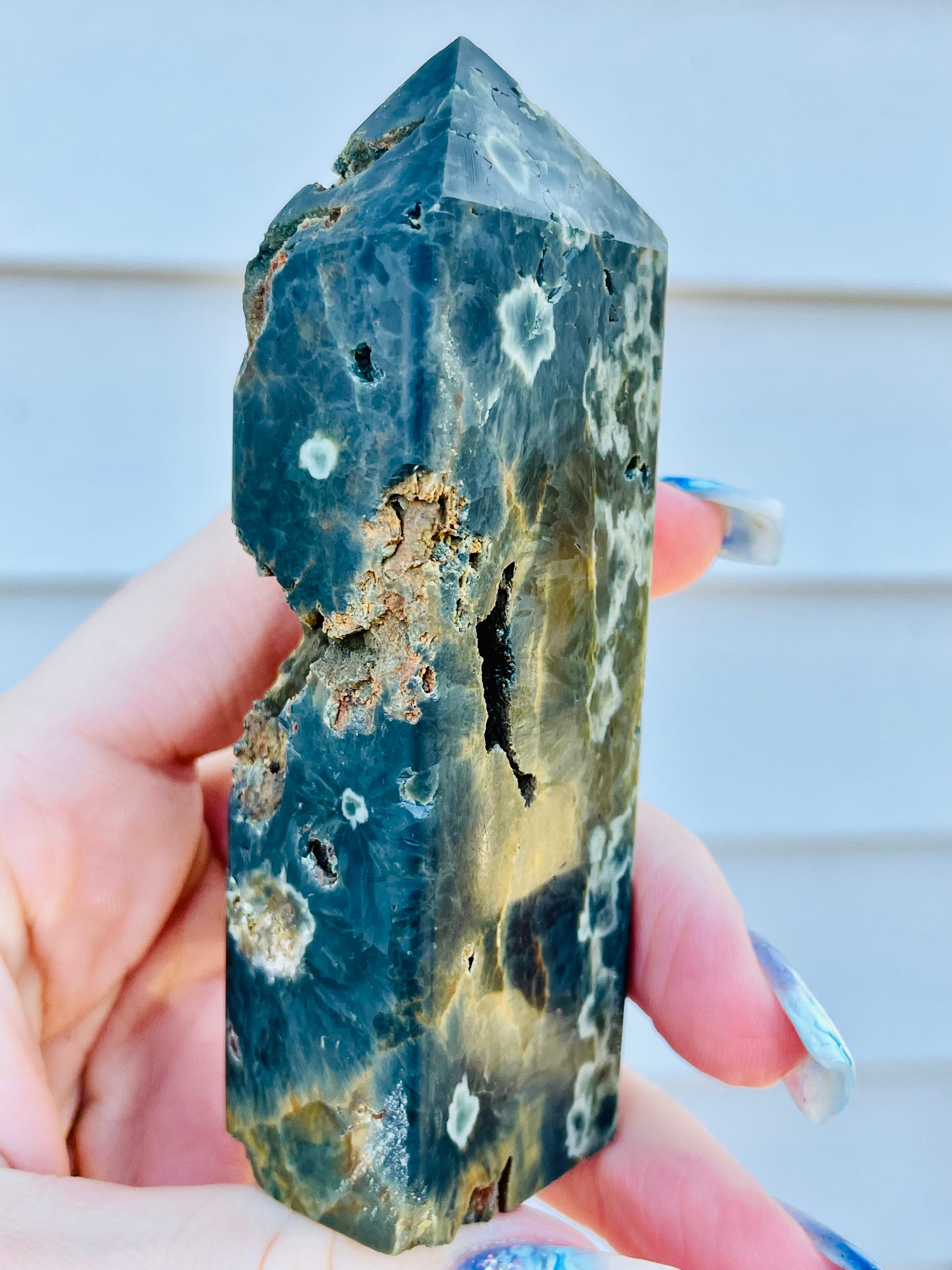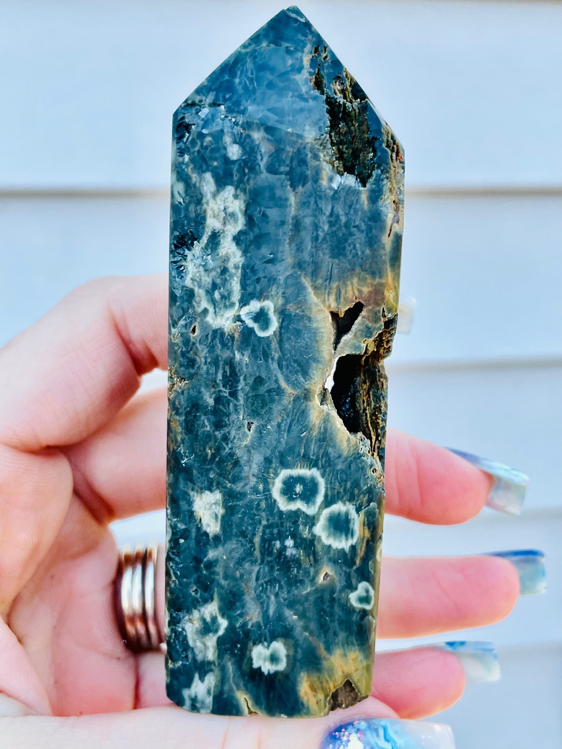 Features: dark earthy tones and fully formed orbitals with fossilized pockets