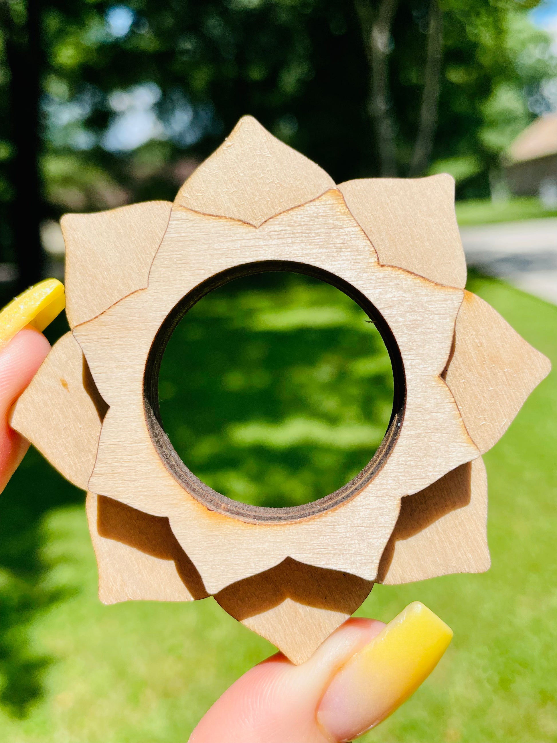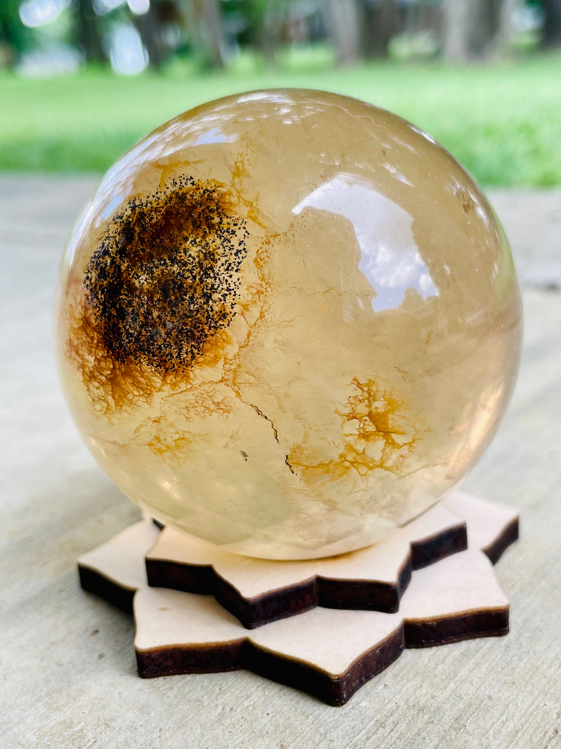 Wood-burned sphere stand.