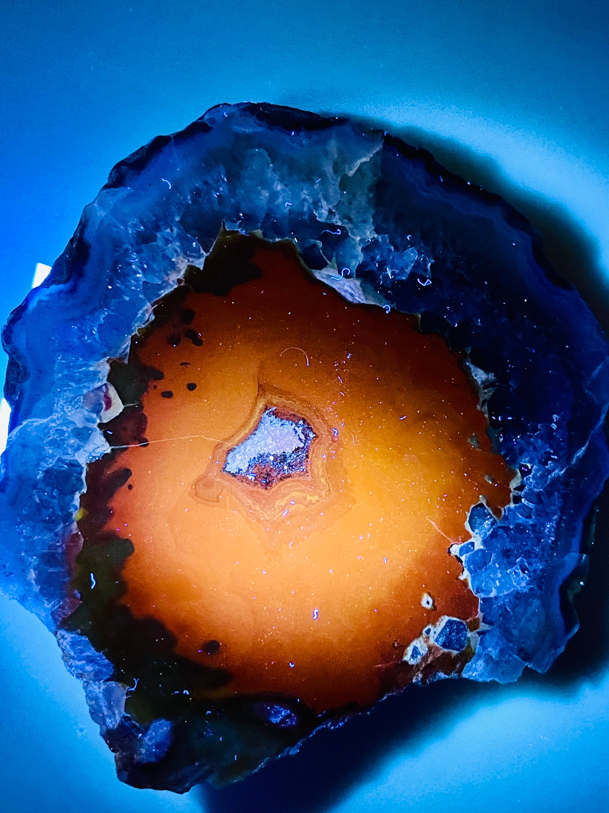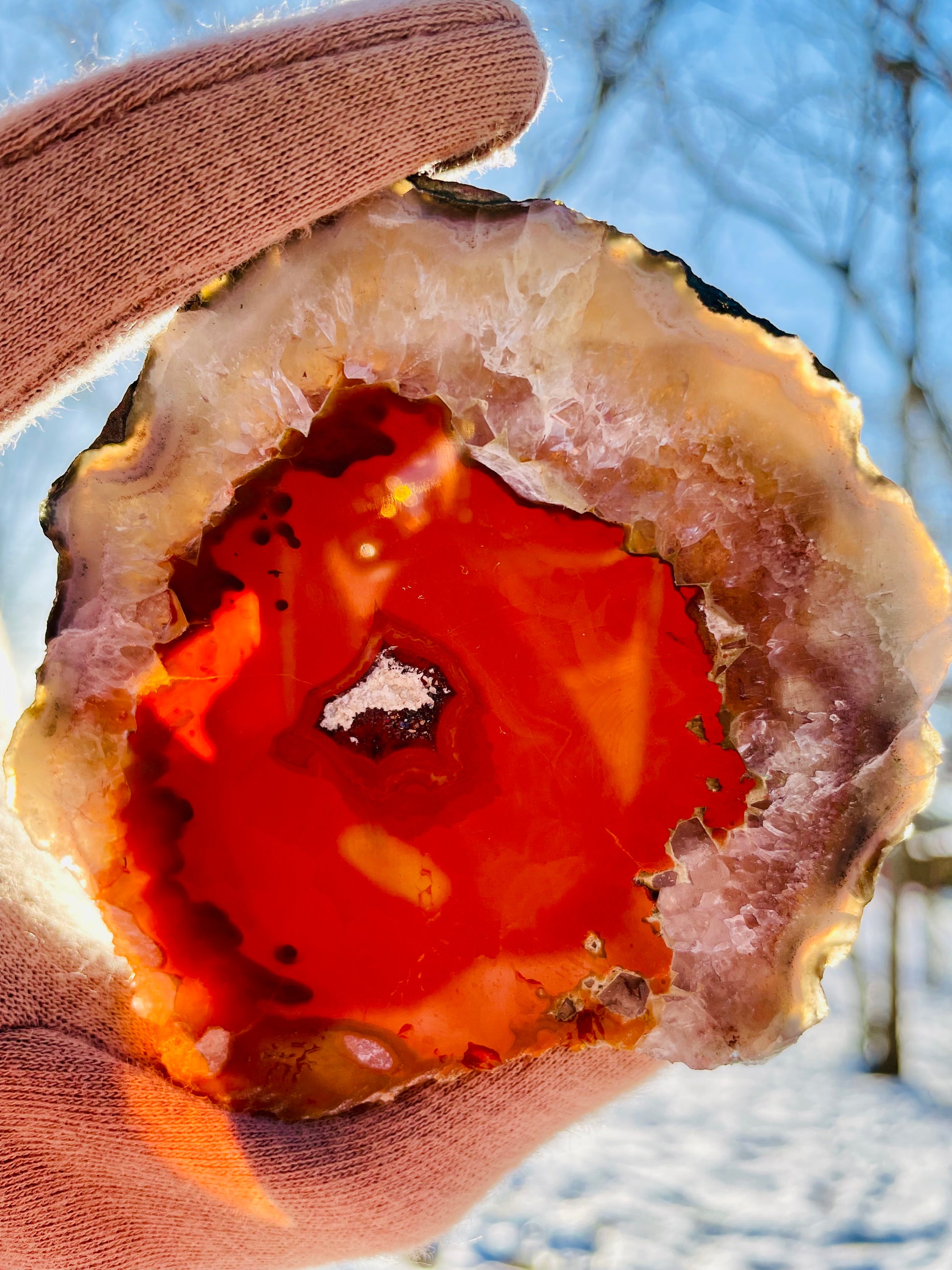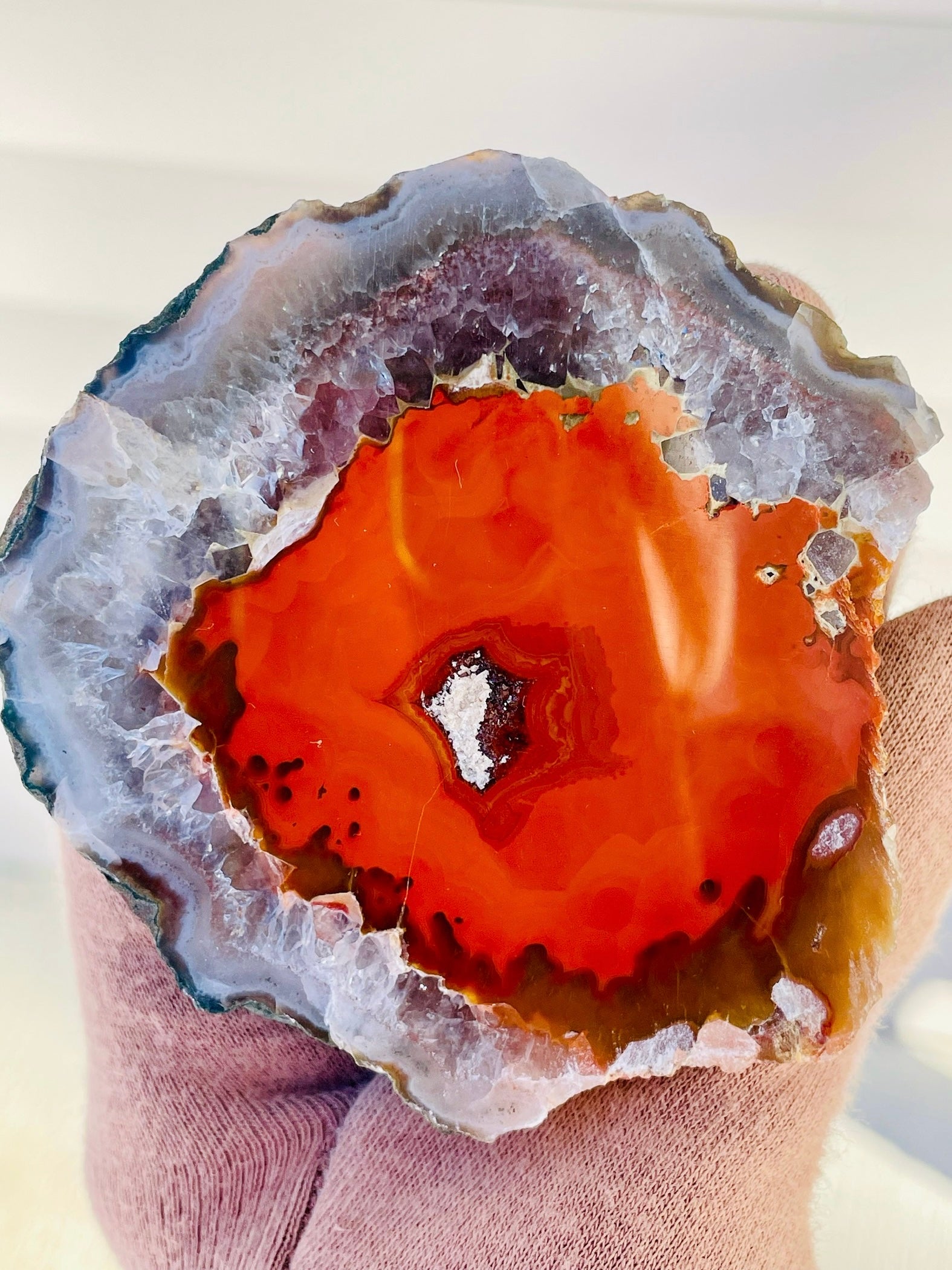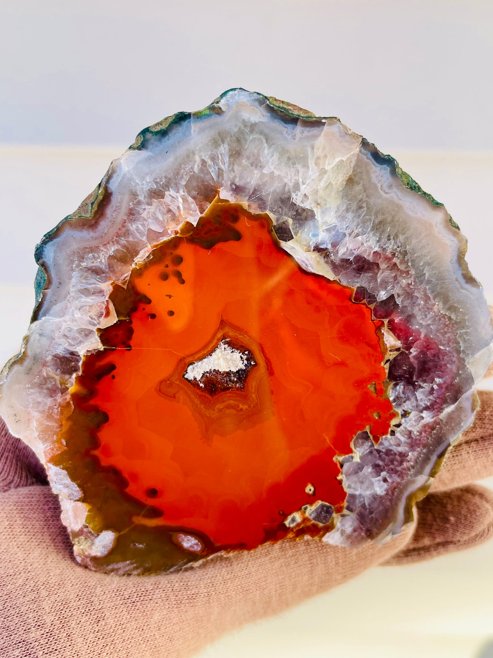 RARE and STUNNING Morocco Agate with amethyst and quartz nodule. Featuring lava red center with an amethyst/quartz/agate outer shell