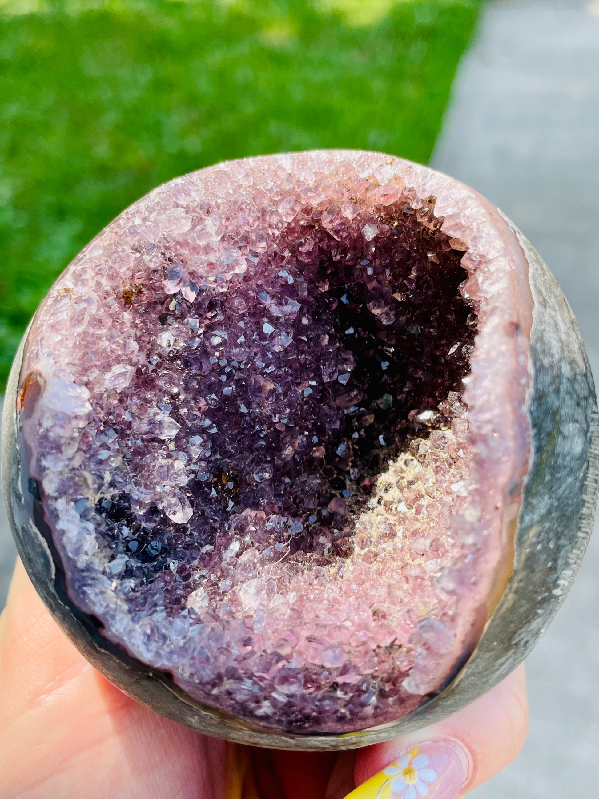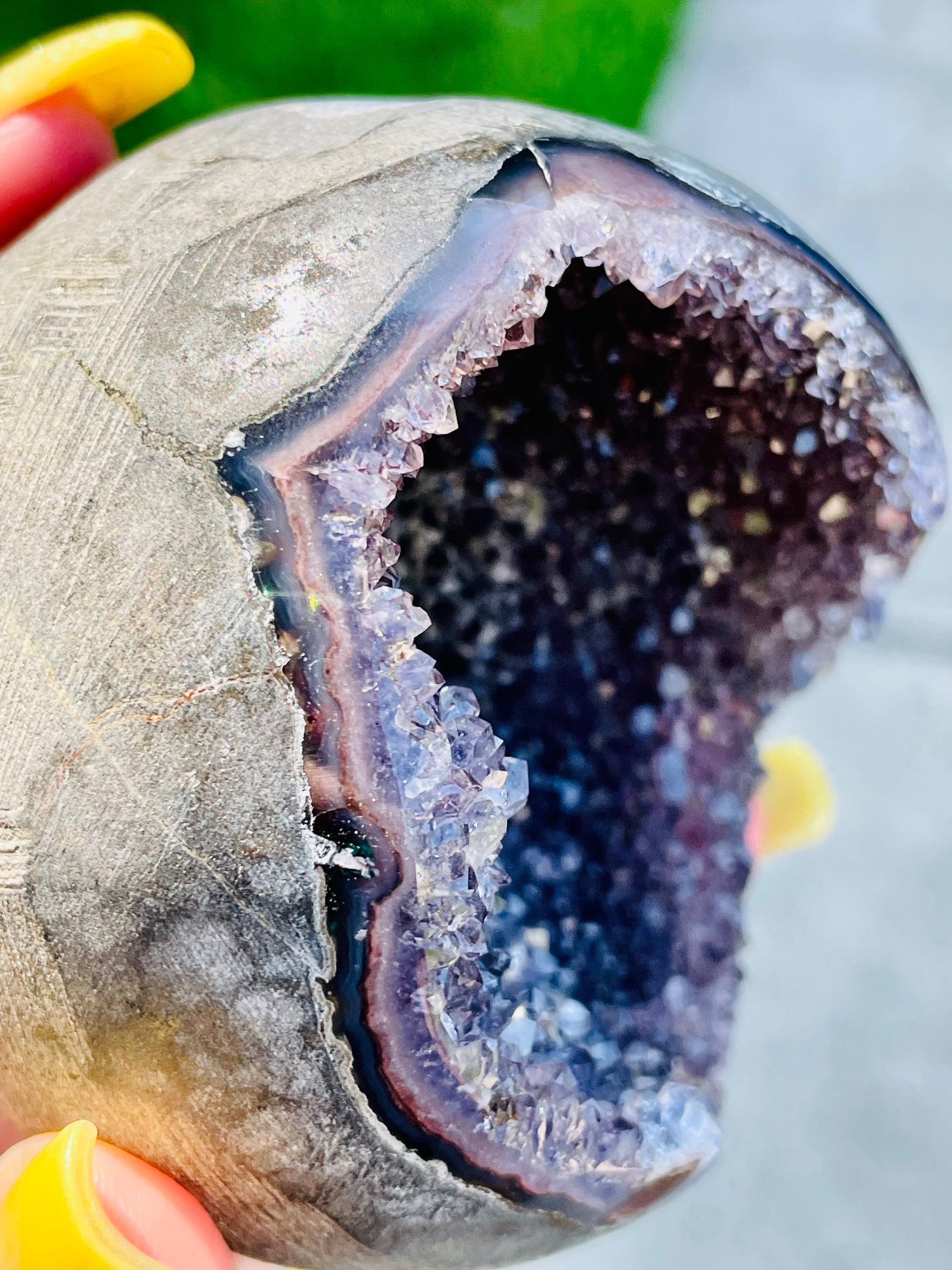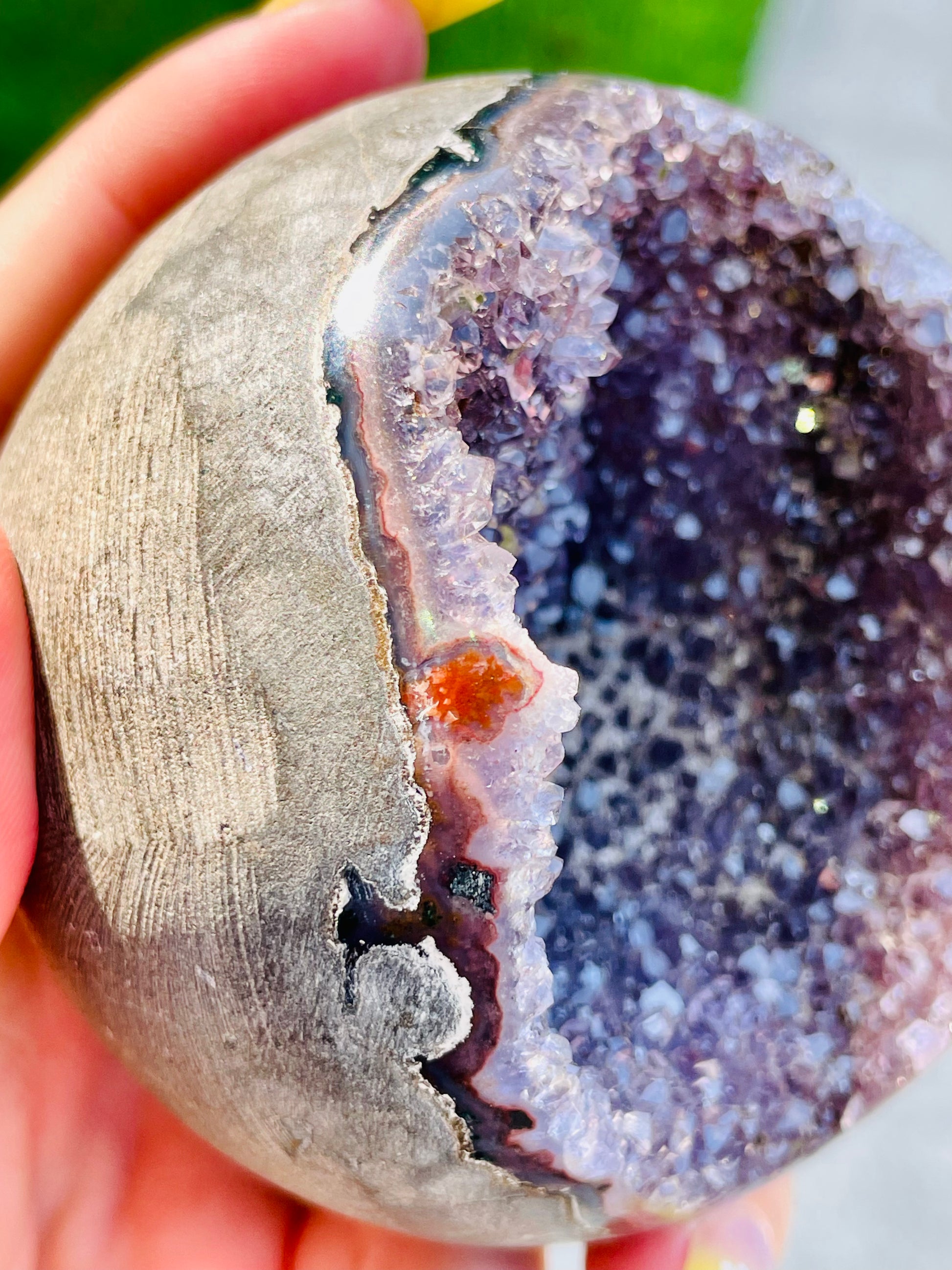 Features: Druzy amethyst with red hematoid inclusions in the base and in the agate/quartz banding