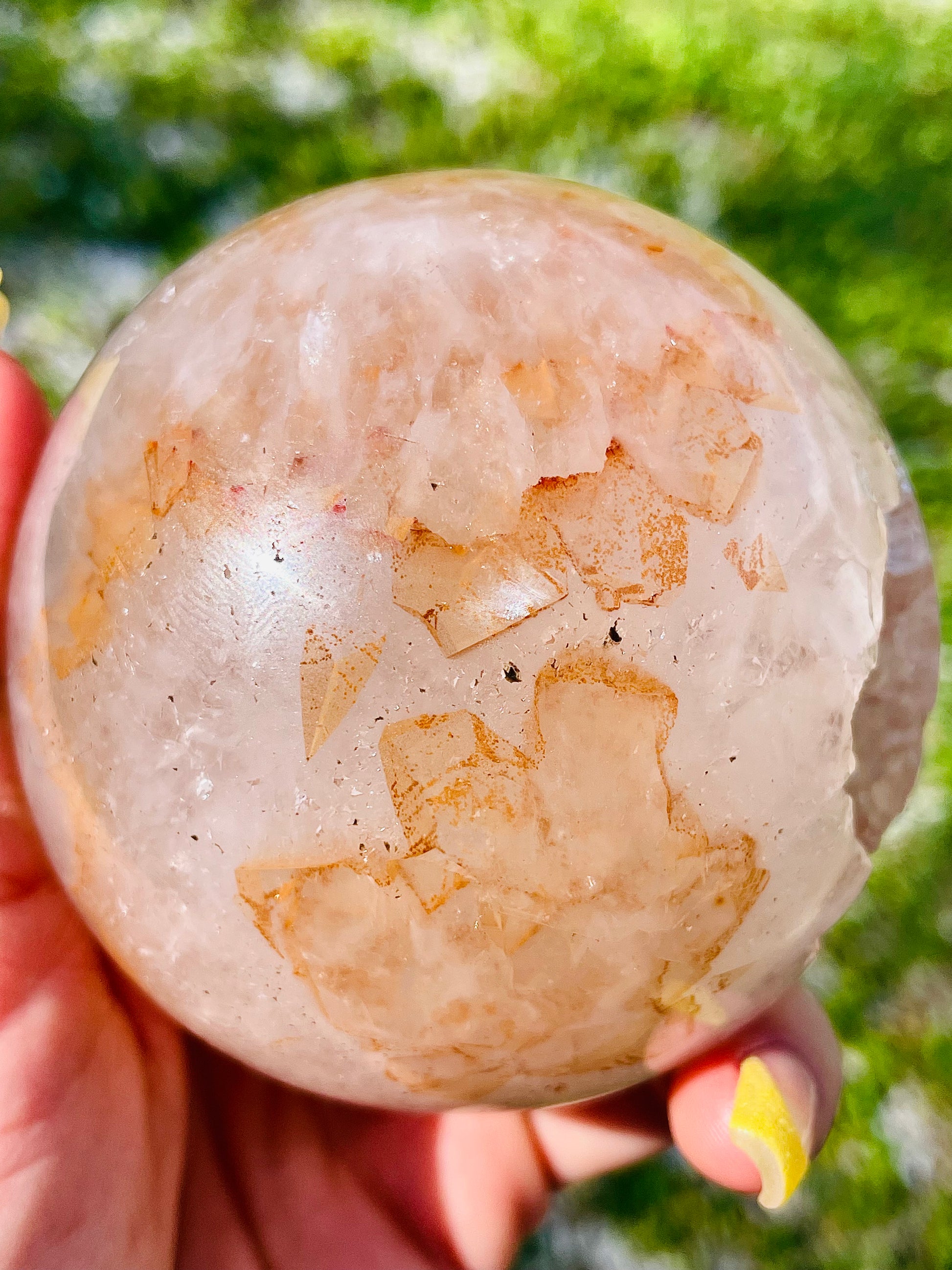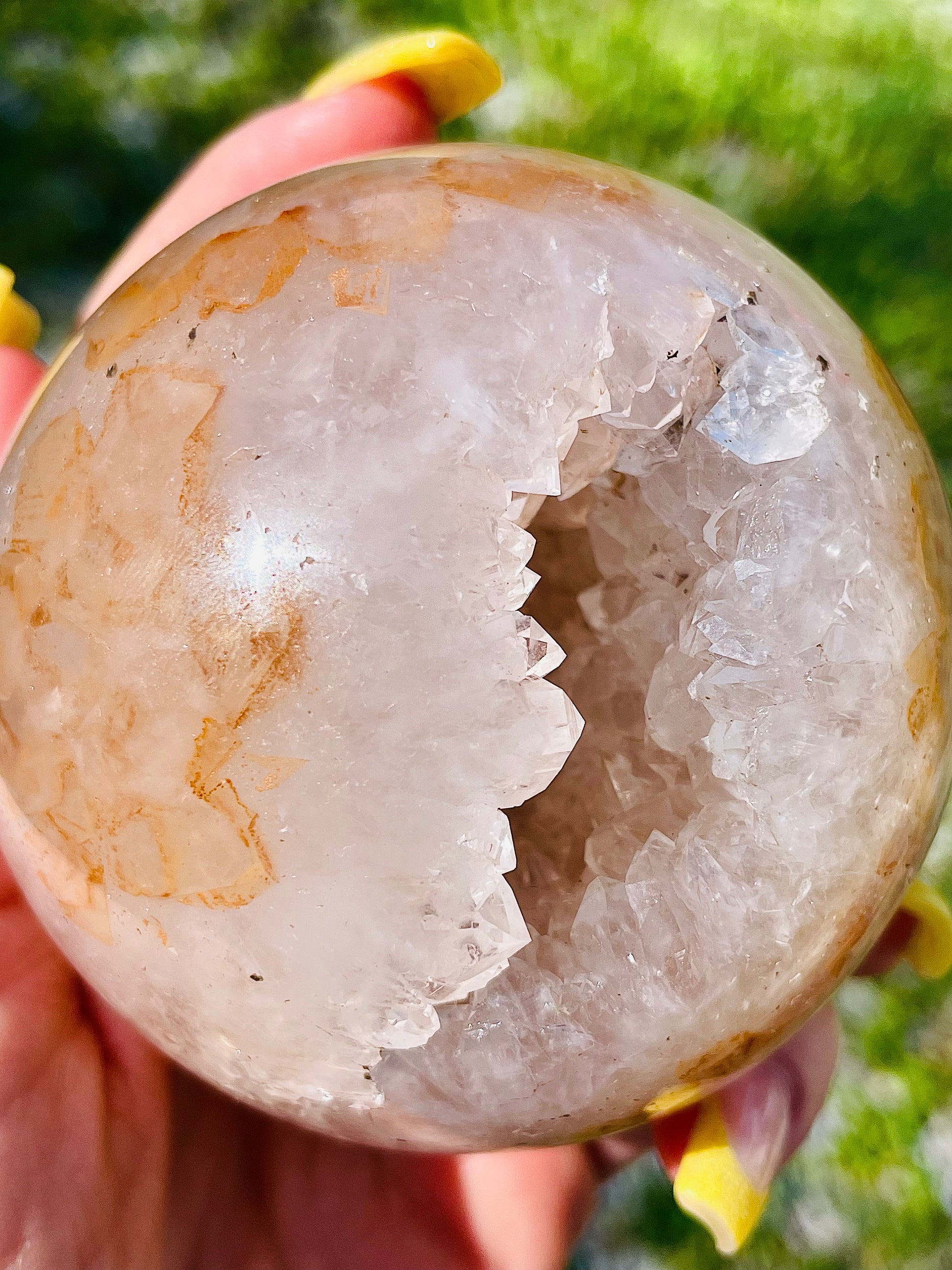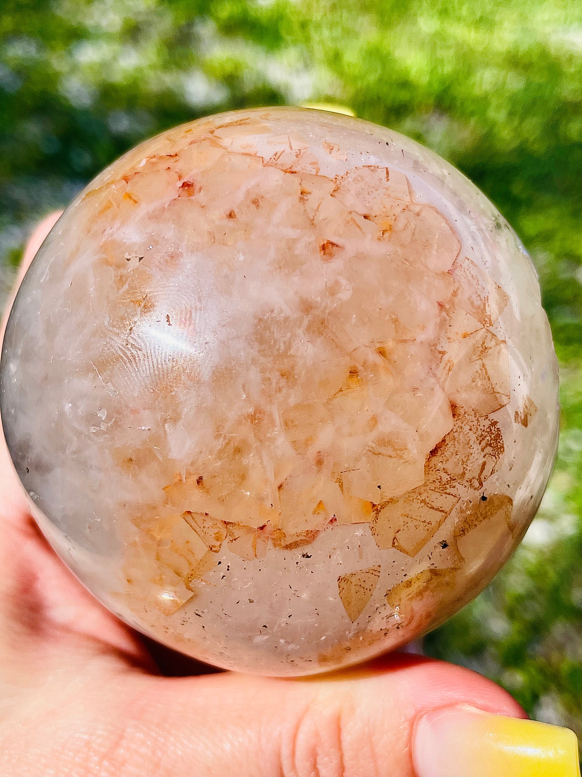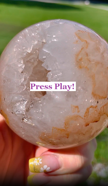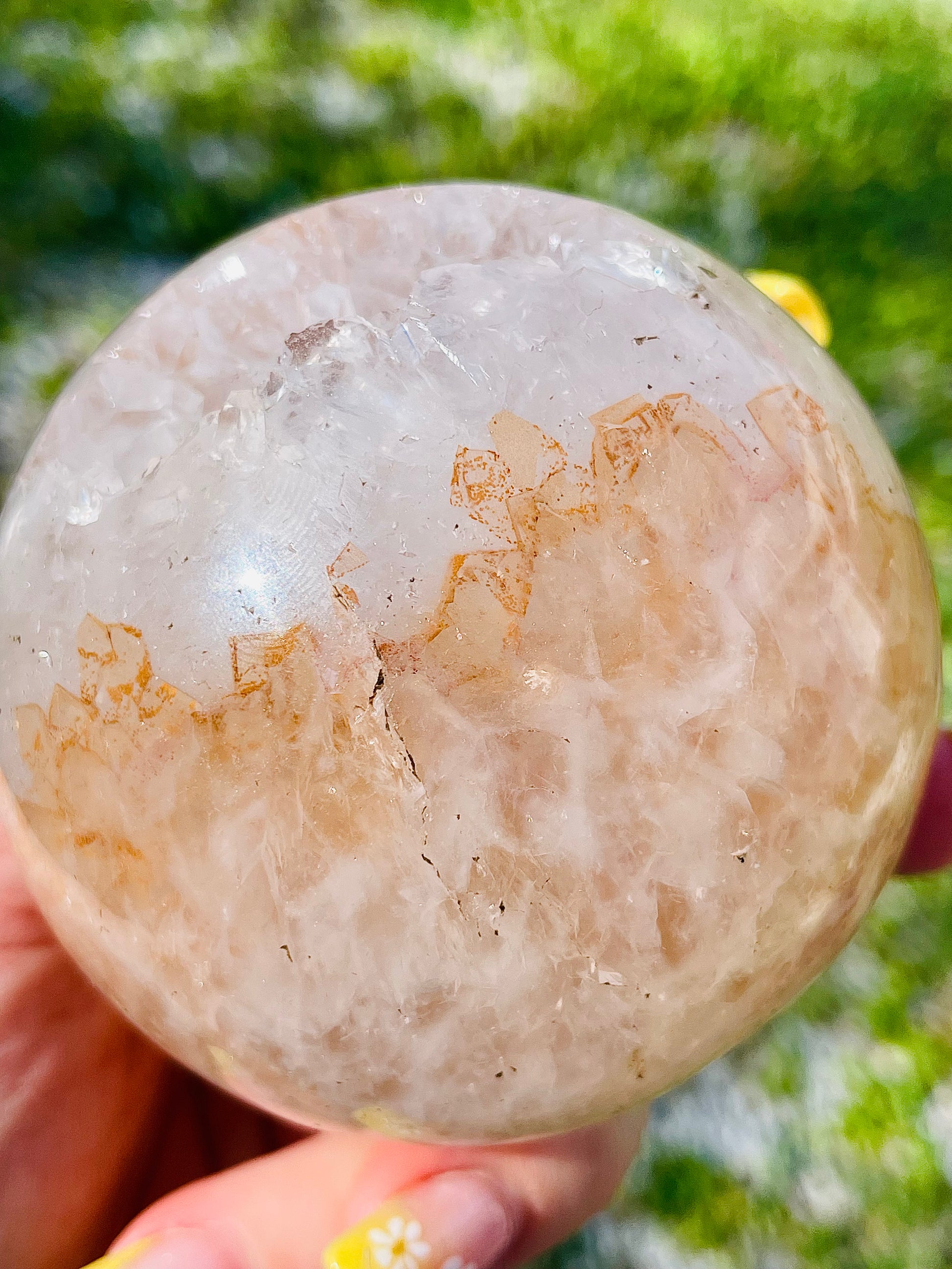 Features: Orange Hematoid which follows the crystal growth structure, giving it its honeycombed appearance AND TONS of rainbows and druzy sparkle!