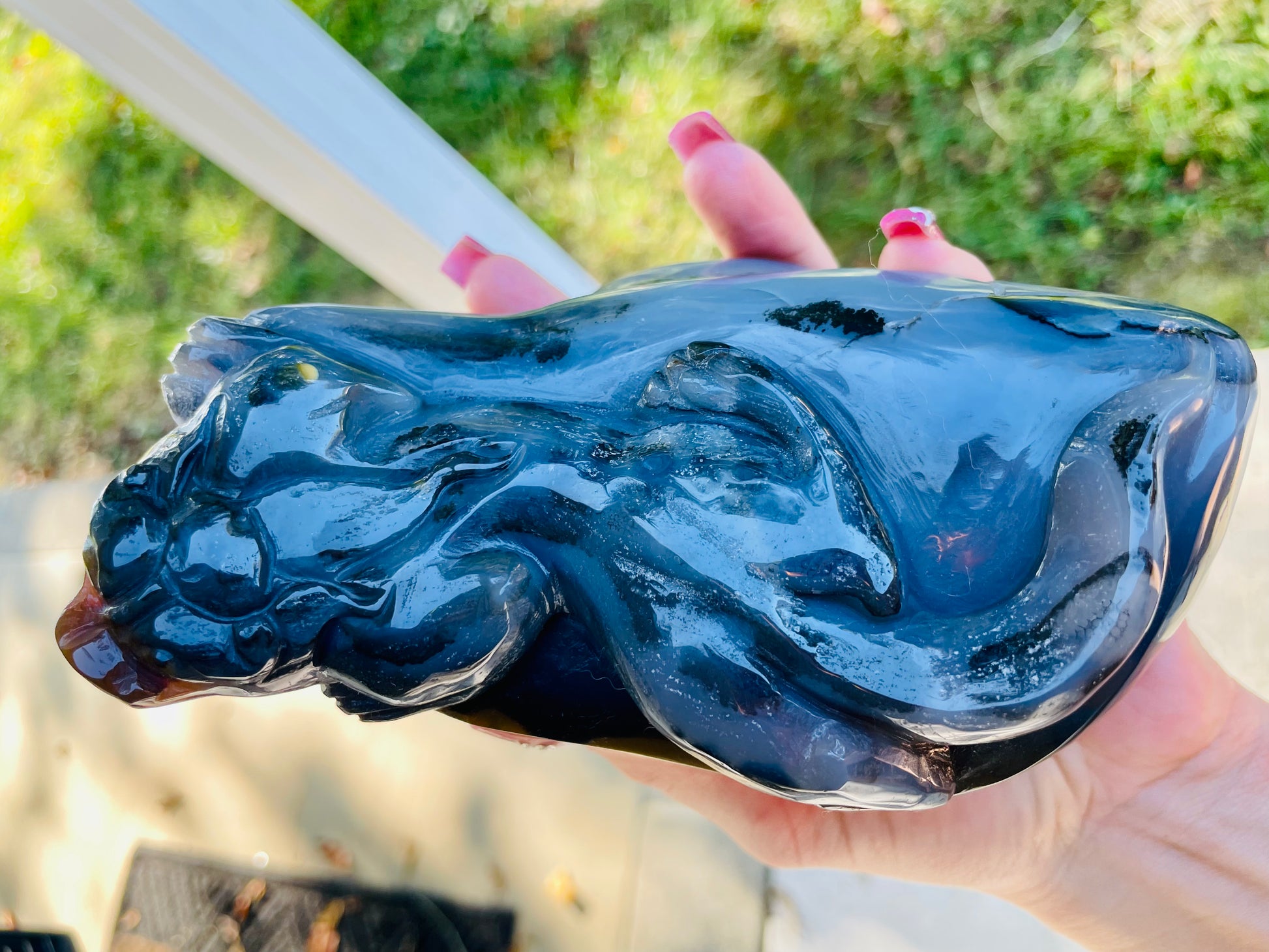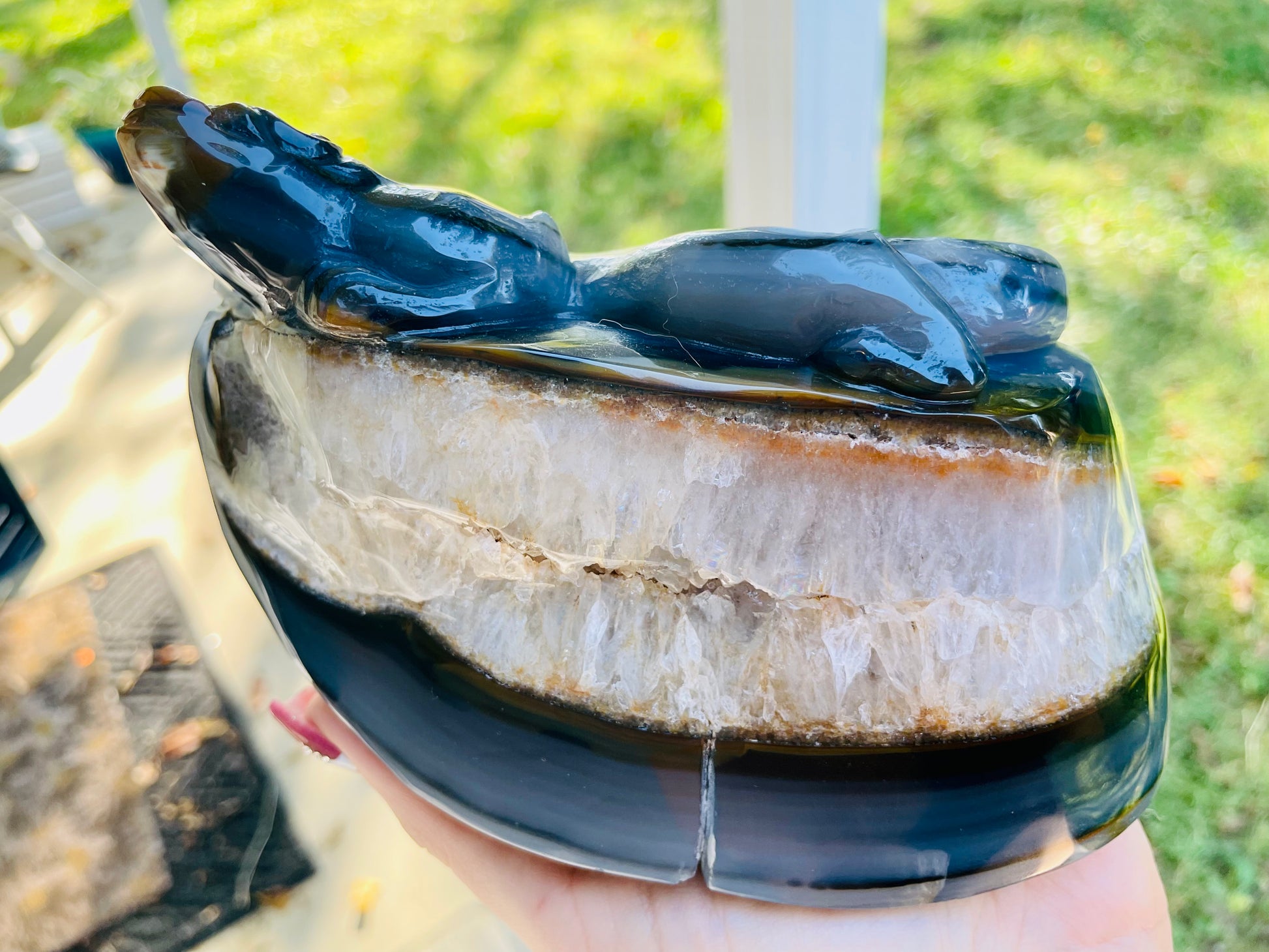 Features: beautiful blue dendric agaate lizard perched atop a LARGE quartz geode - quartz geode has tons of sparkle, rainbows, and hematoid inclusions. The piece overall would be a STUNNING collection piece!